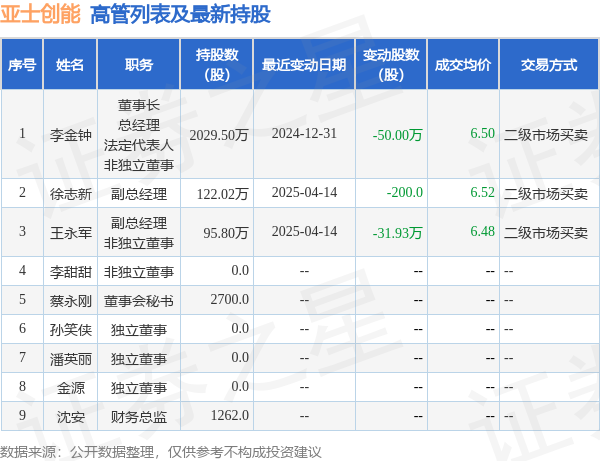 亚士创能的高管列表及最新持股情况如下: