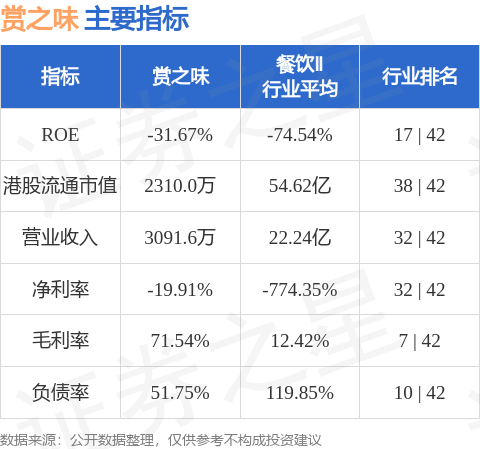 赏之味港股市值2310万港元,在餐饮Ⅱ行业中排名第38。主要指标见下表: