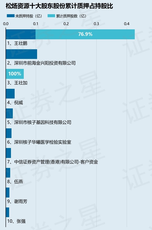 截止本公告日,股东王壮鹏已累计质押股份3286.0万股,占其持股总数的76.9%,股东王壮加已累计质押股份600.0万股,占其持股总数的100.0%。本次质押后松炀资源十大股东的累计质押股份占持股比例(占持股比例的计算以公司最新一期财务报表公布的十大股东的持股总数为基准)见下图: