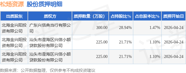证券之星消息,松炀资源(603863)4月28日公开信息显示,股东北海金兴阳投资有限公司向广东兴信典当行有限公司、汕头市澄海区兴信小额贷款股份有限公司合计质押750.0万股,占总股本3.67%。质押详情见下表: