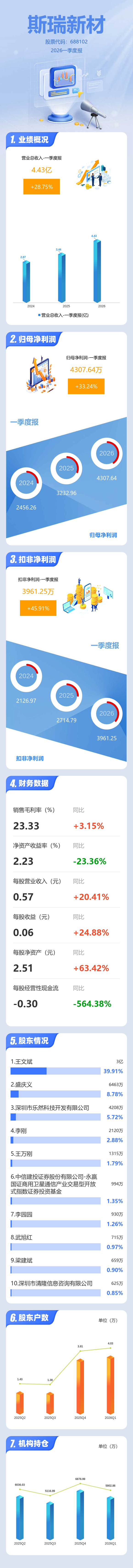 证券之星消息,斯瑞新材2026年一季报显示,一季度公司主营收入4.43亿元,同比上升28.75%;归母净利润4307.64万元,同比上升33.24%;扣非净利润3961.25万元,同比上升45.91%;负债率42.72%,投资收益49.3万元,财务费用785.94万元,毛利率23.33%。