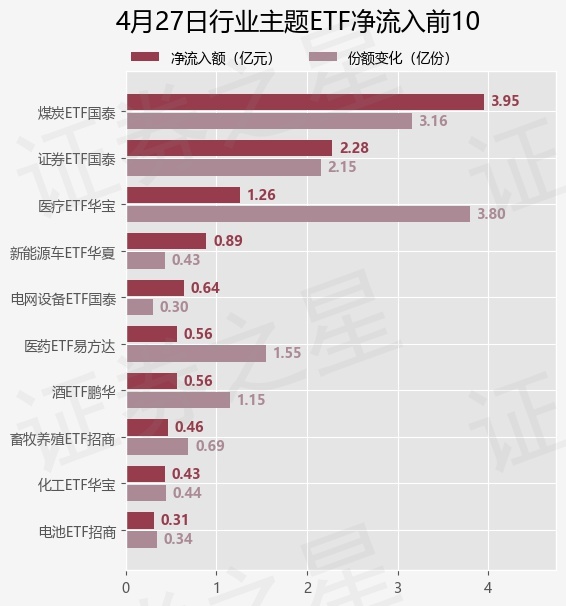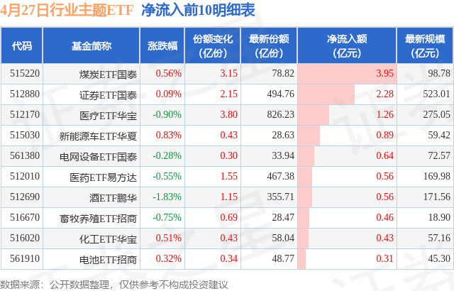 当日有95只行业主题ETF基金出现资金净流入,其中净流入排首位的是煤炭ETF国泰(515220),份额增加了3.15亿份,净流入额为3.95亿元。