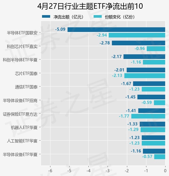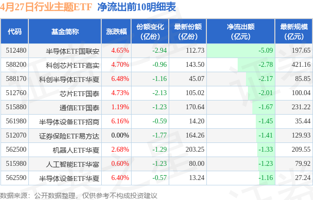 当日有155只行业主题ETF基金出现资金净流出,其中净流出排首位的是半导体ETF国联安(512480),份额减少了2.94亿份,净流出额为5.09亿元。