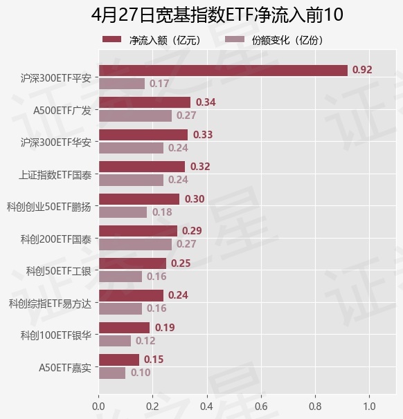 当日有80只宽基指数ETF基金出现资金净流出,其中净流出排首位的是沪深300ETF华泰柏瑞(510300),份额减少了5.6亿份,净流出额为26.81亿元。