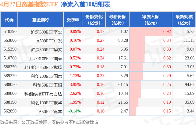 当日有22只宽基指数ETF基金出现资金净流入,其中净流入排首位的是沪深300ETF平安(510390),份额增加了1710.0万份,净流入额为9187.61万元。