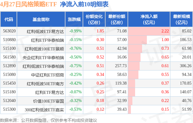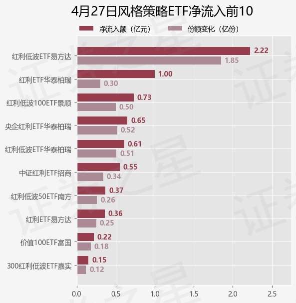 当日有14只风格策略ETF基金出现资金净流入,其中净流入排首位的是红利低波ETF易方达(563020),份额增加了1.85亿份,净流入额为2.22亿元。