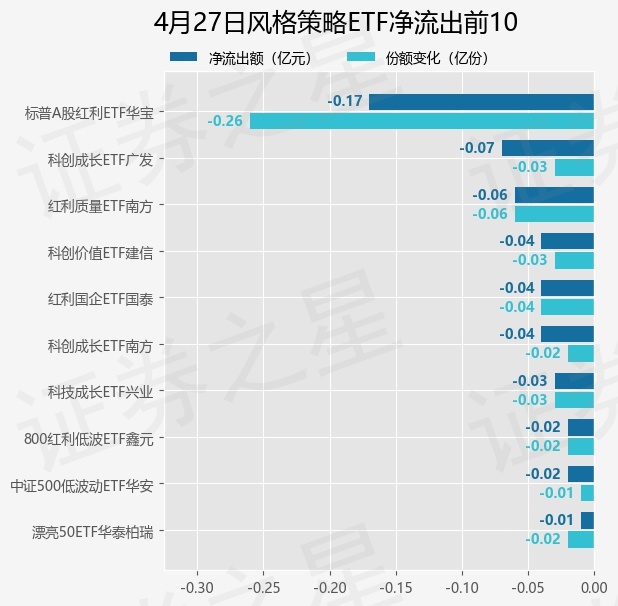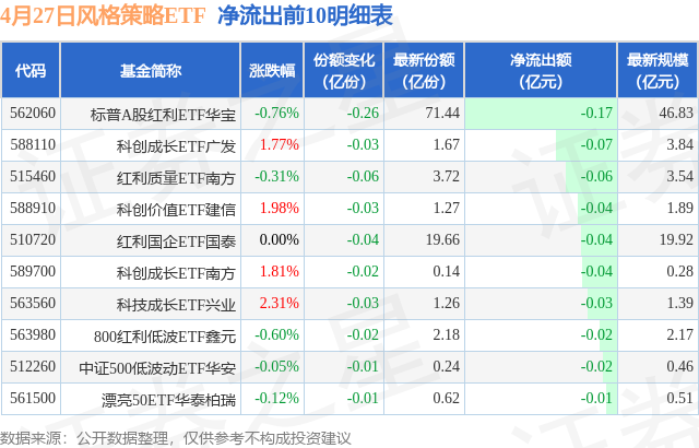 当日有11只风格策略ETF基金出现资金净流出,其中净流出排首位的是标普A股红利ETF华宝(562060),份额减少了2600.0万份,净流出额为1704.19万元。
