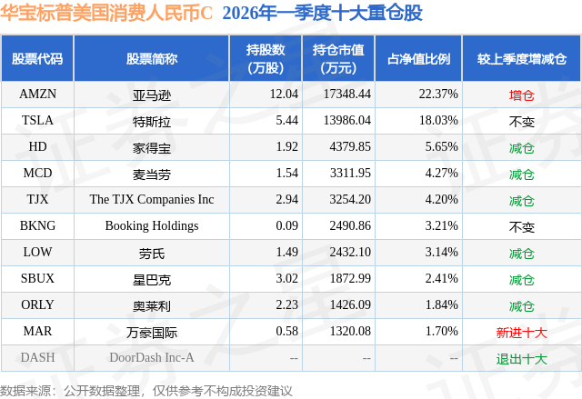 从基金规模来看,华宝标普美国消费人民币C基金2026年一季度公布的基金规模为1.5亿元,较上一期规模5.18亿元变化了-3.67亿元,环比变化了-70.96%。该基金最新一期资产配置为:股票占净值比94.93%,无债券类资产,现金占净值比5.48%。从基金持仓来看,该基金当季前十大股票仓位达66.82%,第一大重仓股为亚马逊(AMZN),持仓占比为22.37%。