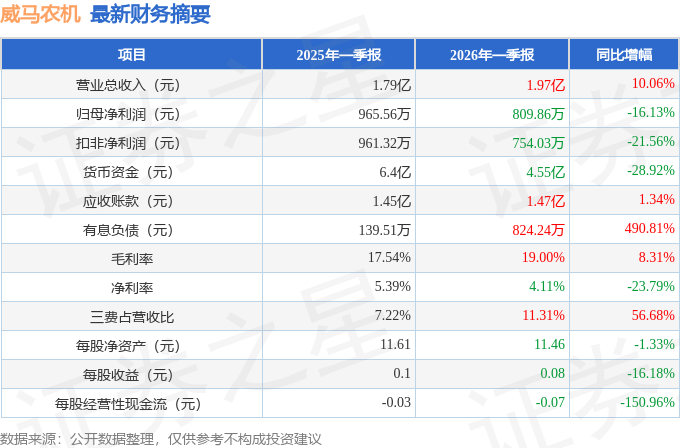 据证券之星公开数据整理,近期威马农机(301533)发布2026年一季报。截至本报告期末,公司营业总收入1.97亿元,同比上升10.06%,归母净利润809.86万元,同比下降16.13%。按单季度数据看,第一季度营业总收入1.97亿元,同比上升10.06%,第一季度归母净利润809.86万元,同比下降16.13%。本报告期威马农机三费占比上升明显,财务费用、销售费用和管理费用总和占总营收同比增幅达56.68%。