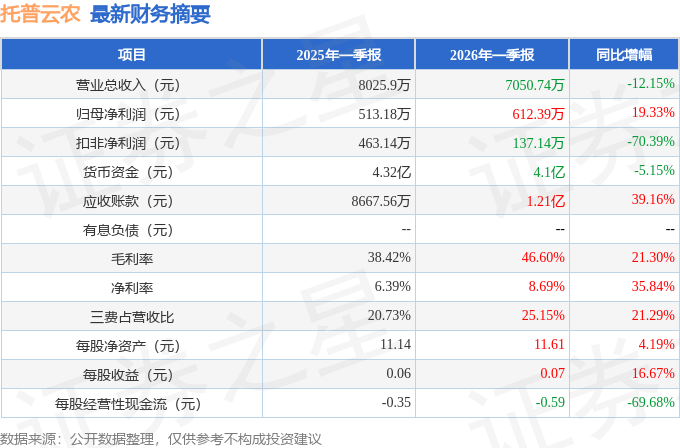 据证券之星公开数据整理,近期托普云农(301556)发布2026年一季报。截至本报告期末,公司营业总收入7050.74万元,同比下降12.15%,归母净利润612.39万元,同比上升19.33%。按单季度数据看,第一季度营业总收入7050.74万元,同比下降12.15%,第一季度归母净利润612.39万元,同比上升19.33%。本报告期托普云农应收账款上升,应收账款同比增幅达39.16%。