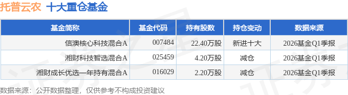 持有托普云农最多的基金为信澳核心科技混合A,目前规模为2.98亿元,最新净值1.602(4月27日),较上一交易日上涨1.51%,近一年上涨18.46%。该基金现任基金经理为徐聪。