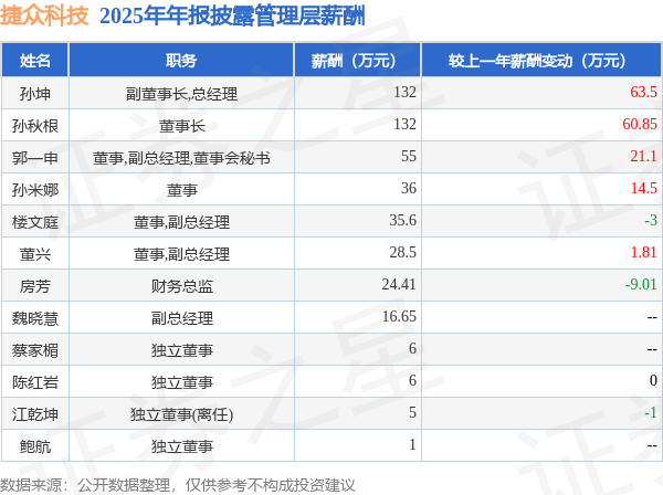 证券之星消息,捷众科技发布2025年年报,数据显示:公司主营收入3.91亿元,同比增36.66%。归母净利润为7208.31万元,同比增15.31%。扣非净利润为7131.2万元,同比增35.49%。当年公司员工总数459人,同比增1.55%。人均薪酬14.63万元(注:"人均薪酬"根据定期报告中"应付职工薪酬"附注的本期增加值 / 员工总数计算而来),同比增41.27%。人均创收85.09万元,同比增34.57%。人均创利15.7万元,同比增13.55%。其中管理层薪酬总额为478.16万元,同比上一年增25.69%,薪酬最高的为副董事长,总经理孙坤,薪酬132.0万元。