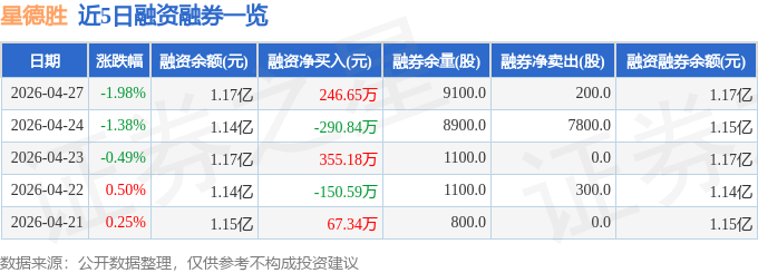 证券之星消息,截至2026年4月27日收盘,星德胜(603344)报收于27.26元,下跌1.98%,换手率4.6%,成交量2.49万手,成交额6674.18万元。