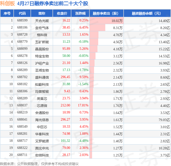科创板融券净卖出前三分别为:天合光能(688599)融券净卖出18.02万股、金宏气体(688106)融券净卖出8.31万股、格科微(688728)融券净卖出4.7万股,前20具体见下表: