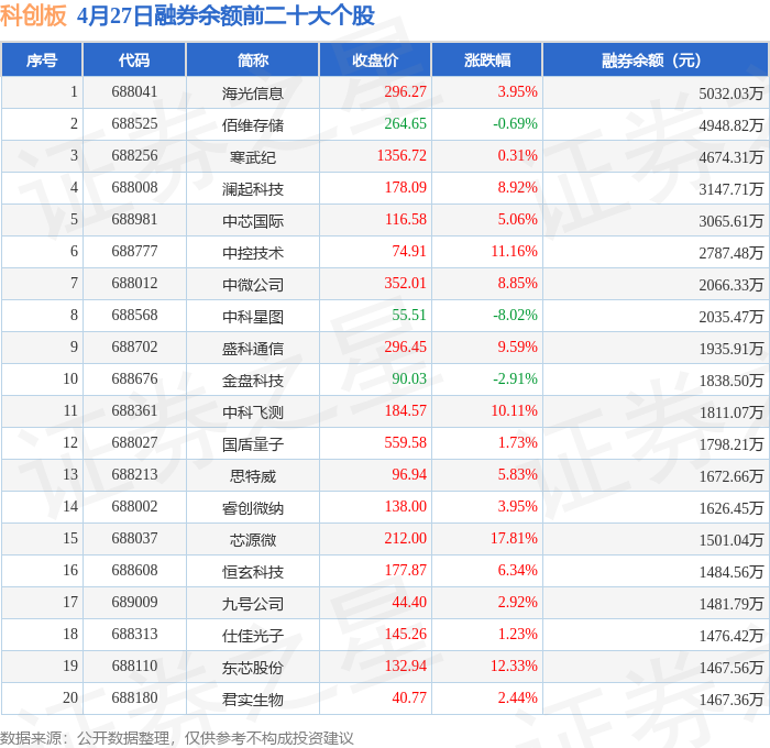 科创板融券余额前三分别为:海光信息(688041)融券余额5032.03万元、佰维存储(688525)融券余额4948.82万元、寒武纪(688256)融券余额4674.31万元,前20具体见下表: