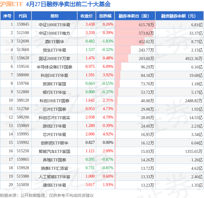 沪深ETF融券净卖出前三分别为:中证1000ETF华夏(159845)融券净卖出615.78万股、中证1000ETF南方(512100)融券净卖出573.82万股、酒ETF鹏华(512690)融券净卖出452.02万股,前20具体见下表:
