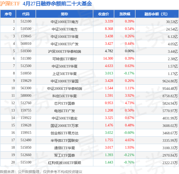 沪深ETF融券余额前三分别为:中证1000ETF南方(512100)融券余额30.53亿元、中证500ETF南方(510500)融券余额24.54亿元、中证1000ETF华夏(159845)融券余额6.12亿元,前20具体见下表: