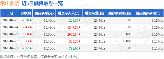 证券之星消息,截至2026年4月27日收盘,常山北明(000158)报收于18.41元,下跌2.28%,换手率2.87%,成交量45.59万手,成交额8.42亿元。