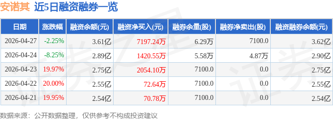 安诺其融资融券信息显示,融资方面,当日融资买入1.83亿元,融资偿还1.11亿元,融资净买入7197.24万元,连续3日净买入累计1.07亿元。融券方面,融券卖出7100.0股,融券偿还0.0股,融券余量6.29万股,融券余额41.01万元。融资融券余额3.62亿元。