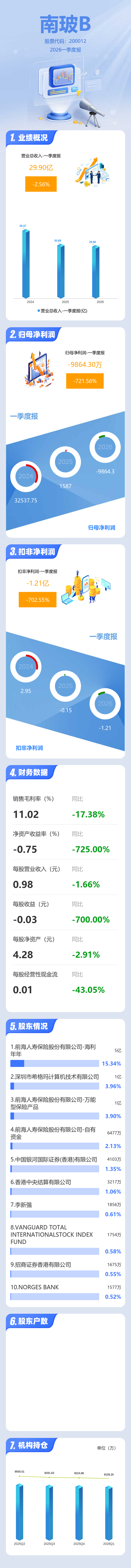 证券之星消息,南玻B2026年一季报显示,一季度公司主营收入29.9亿元,同比下降2.56%;归母净利润-9864.3万元,同比下降721.57%;扣非净利润-1.21亿元,同比下降702.55%;负债率57.59%,投资收益-77.54万元,财务费用5980.59万元,毛利率11.02%。