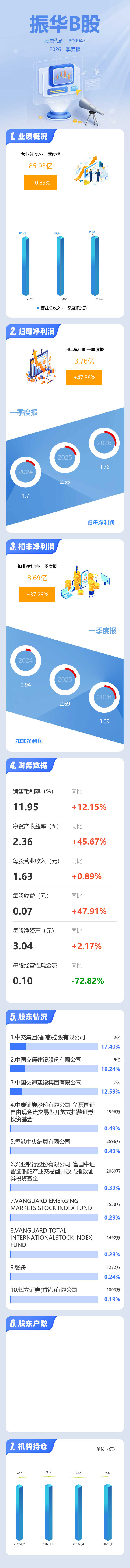 证券之星消息,振华B股2026年一季报显示,一季度公司主营收入85.93亿元,同比上升0.89%;归母净利润3.76亿元,同比上升47.39%;扣非净利润3.69亿元,同比上升37.29%;负债率76.23%,投资收益299.91万元,财务费用1.54亿元,毛利率11.95%。
