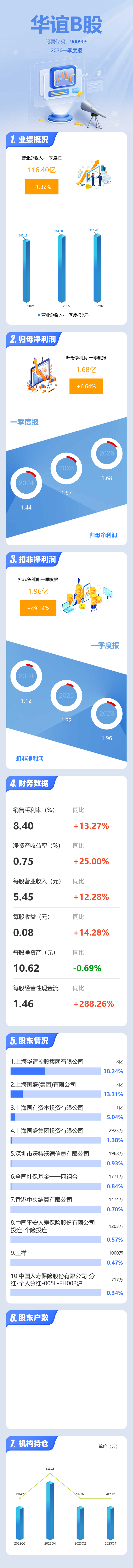 证券之星消息,华谊B股2026年一季报显示,一季度公司主营收入116.4亿元,同比上升1.32%;归母净利润1.68亿元,同比上升6.64%;扣非净利润1.96亿元,同比上升49.14%;负债率56.85%,投资收益7282.39万元,财务费用9688.62万元,毛利率8.4%。