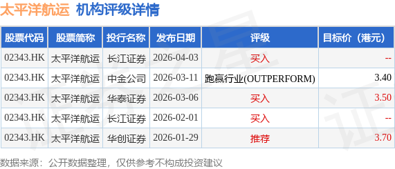 投行对该股的评级以买入为主,近90天内共有3家投行给出买入评级,近90天的目标均价为3.53港元。长江证券最新一份研报给予太平洋航运买入评级。
