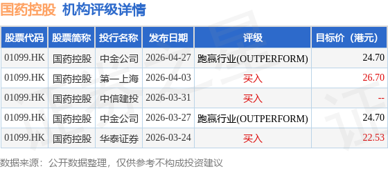 投行对该股的评级以买入为主,近90天内共有3家投行给出买入评级,近90天的目标均价为24.66港元。中金公司最新一份研报给予国药控股跑赢行业(OUTPERFORM)评级,目标价24.7港元。