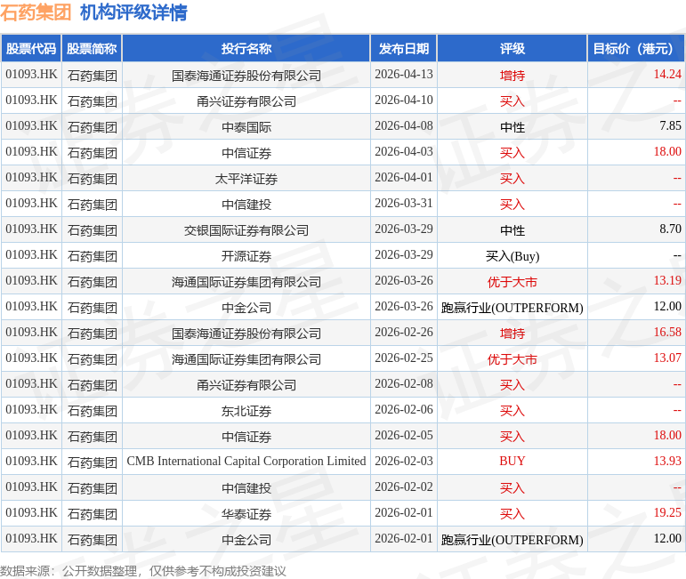 投行对该股的评级以买入为主,近90天内共有9家投行给出买入评级,近90天的目标均价为13.9港元。国泰海通证券股份有限公司最新一份研报给予石药集团增持评级,目标价14.24港元。