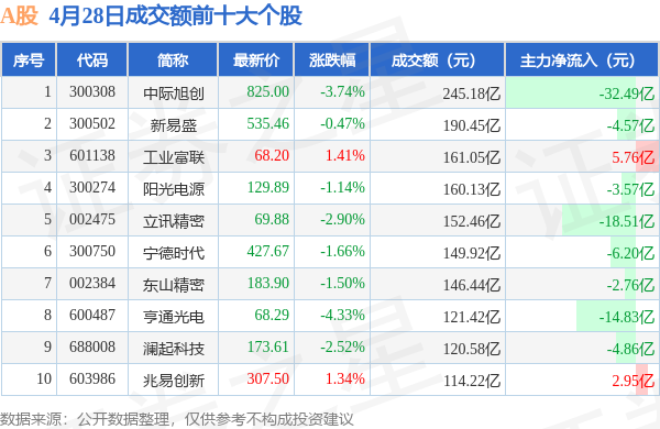 当日A股成交额前10大个股中2只个股收涨,平均涨幅1.38%,其中中际旭创(300308)以成交额245.18亿元排第一。从主力资金流入看,成交额前10大个股中有2只个股呈现主力资金净流入。