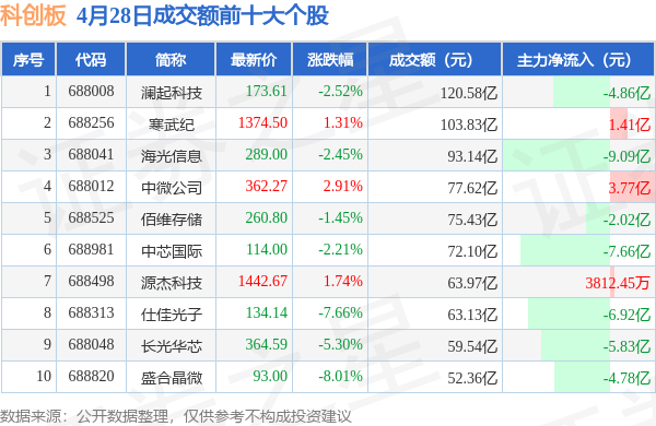 当日科创板成交额前10大个股中3只个股收涨,平均涨幅1.99%,其中澜起科技(688008)以成交额120.58亿元排第一。从主力资金流入看,成交额前10大个股中有3只个股呈现主力资金净流入。