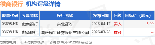 截至2026年4月28日收盘,徽商银行(03698.HK)报收于5.19港元,上涨3.39%,成交量2901.84万股,成交额1.48亿港元。投行对该股的评级以推荐为主,近90天内共有1家投行给出推荐评级,近90天的目标均价为5.99港元。东北证券最新一份研报给予徽商银行买入评级,目标价5.99港元。