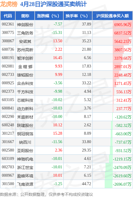 龙虎榜中有沪股通/深股通专用席位(北向资金)现身的个股共25家,其中神剑股份以净买入6905.96万元排名第一。详情见下表:
