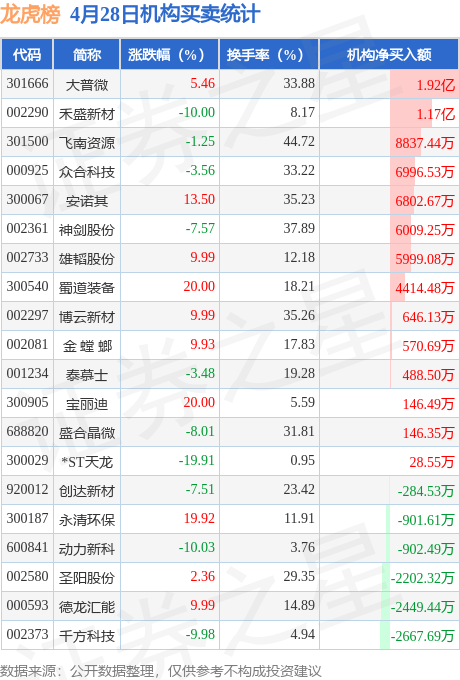 当日公布的交易所龙虎榜中有机构专用席位现身的个股共28家,其中大普微以净买入1.92亿元排名第一。详情见下表: