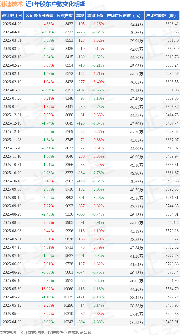 证券之星消息,近日港迪技术披露,截至2026年4月20日公司股东户数为8432.0户,较4月10日增加105.0户,增幅为1.26%。户均持股数量由上期的6687.0股减少至6603.0股,户均持股市值为42.22万元。