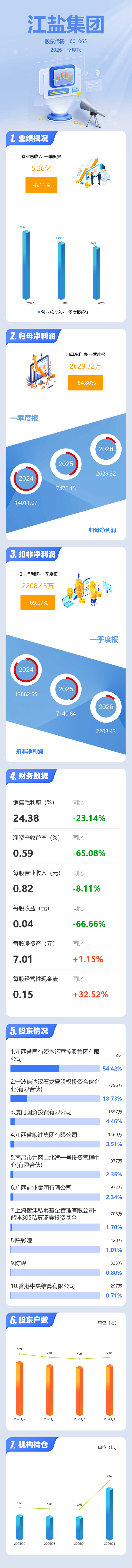 证券之星消息,江盐集团2026年一季报显示,一季度公司主营收入5.26亿元,同比下降8.11%;归母净利润2629.32万元,同比下降64.8%;扣非净利润2208.43万元,同比下降69.07%;负债率18.63%,投资收益0.0万元,财务费用86.89万元,毛利率24.38%。