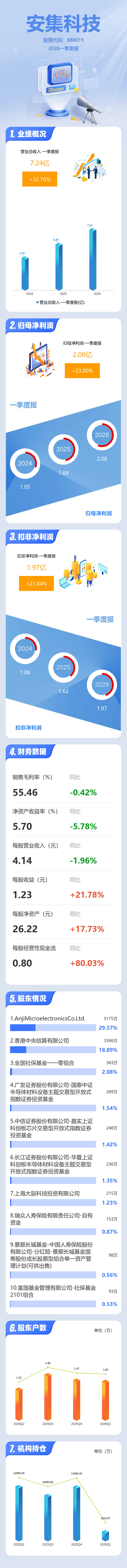 证券之星消息,安集科技2026年一季报显示,一季度公司主营收入7.24亿元,同比上升32.76%;归母净利润2.08亿元,同比上升23.01%;扣非净利润1.97亿元,同比上升21.65%;负债率15.7%,投资收益1043.24万元,财务费用2013.09万元,毛利率55.46%。