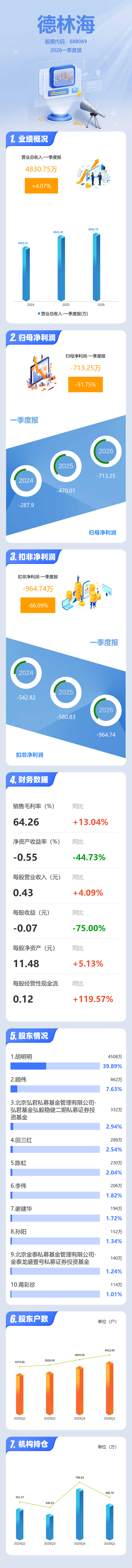 证券之星消息,德林海2026年一季报显示,一季度公司主营收入4830.75万元,同比上升4.08%;归母净利润-713.25万元,同比下降51.75%;扣非净利润-964.74万元,同比下降66.1%;负债率21.84%,投资收益30.07万元,财务费用-105.63万元,毛利率64.26%。