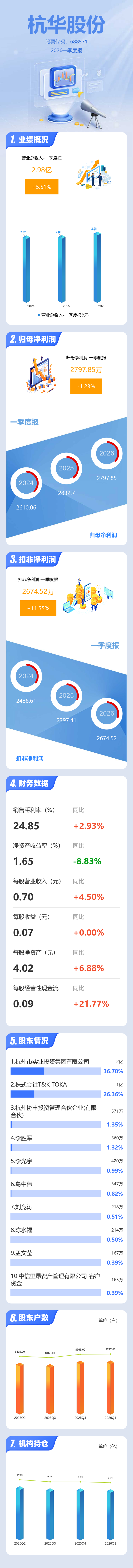 证券之星消息,杭华股份2026年一季报显示,一季度公司主营收入2.98亿元,同比上升5.51%;归母净利润2797.85万元,同比下降1.23%;扣非净利润2674.52万元,同比上升11.56%;负债率23.25%,投资收益161.09万元,财务费用-42.4万元,毛利率24.85%。