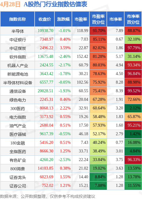 热门行业指数方面,半导体的市盈率百分位较高,为91.7%。而证券公司的市盈率百分位较低,为7.88%。