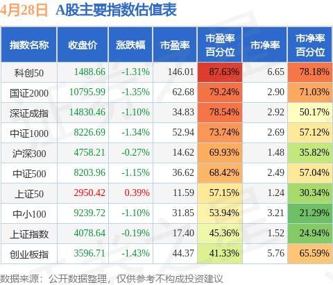 A股主要宽基指数方面,科创50的市盈率百分位较高,为87.63%。而创业板指的市盈率百分位较低,为41.33%。