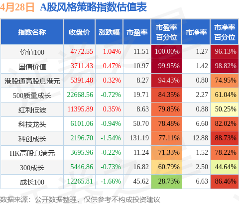 风格策略指数方面,价值100的市盈率百分位较高,为100.0%。而成长100的市盈率百分位较低,为28.73%。