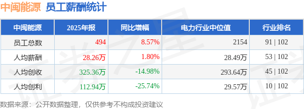 证券之星消息,4月29日中闽能源公布2025年年报,当年营收16.07亿元,同比减7.69%;净利润为5.22亿元,同比减19.89%。根据财报数据披露,当年公司员工总数494人,同比增8.57%;人均薪酬28.26万元,同比增1.8%;人均创收325.36万元,同比减14.98%;人均创利112.94万元,同比减25.74%;公司员工薪酬统计见下表: