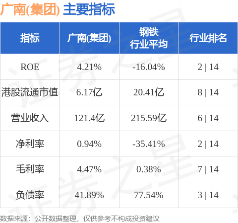 广南(集团)港股市值6.17亿港元,在钢铁行业中排名第8。主要指标见下表: