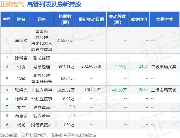 正弦电气的高管列表及最新持股情况如下: