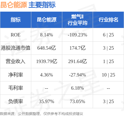 昆仑能源港股市值648.54亿港元,在燃气Ⅱ行业中排名第3。主要指标见下表: