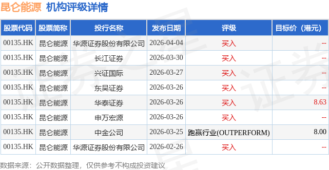 截至2026年4月28日收盘,昆仑能源(00135.HK)报收于7.66港元,上涨2.27%,成交量1803.0万股,成交额1.37亿港元。投行对该股的评级以买入为主,近90天内共有7家投行给出买入评级,近90天的目标均价为8.32港元。华源证券股份有限公司最新一份研报给予昆仑能源买入评级。