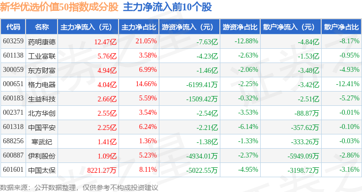 资金流向方面,新华优选价值50(989004)指数成份股当日主力资金净流出合计86.7亿元,游资资金净流入合计38.74亿元,散户资金净流入合计47.96亿元。成份股资金流向详情见下表: