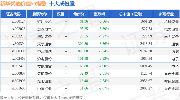 新华优选价值50(989004)指数十大成份股详情如下: