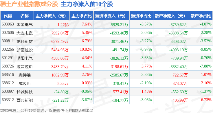 资金流向方面,稀土产业链(989013)指数成份股当日主力资金净流出合计61.43亿元,游资资金净流入合计16.78亿元,散户资金净流入合计44.65亿元。成份股资金流向详情见下表: